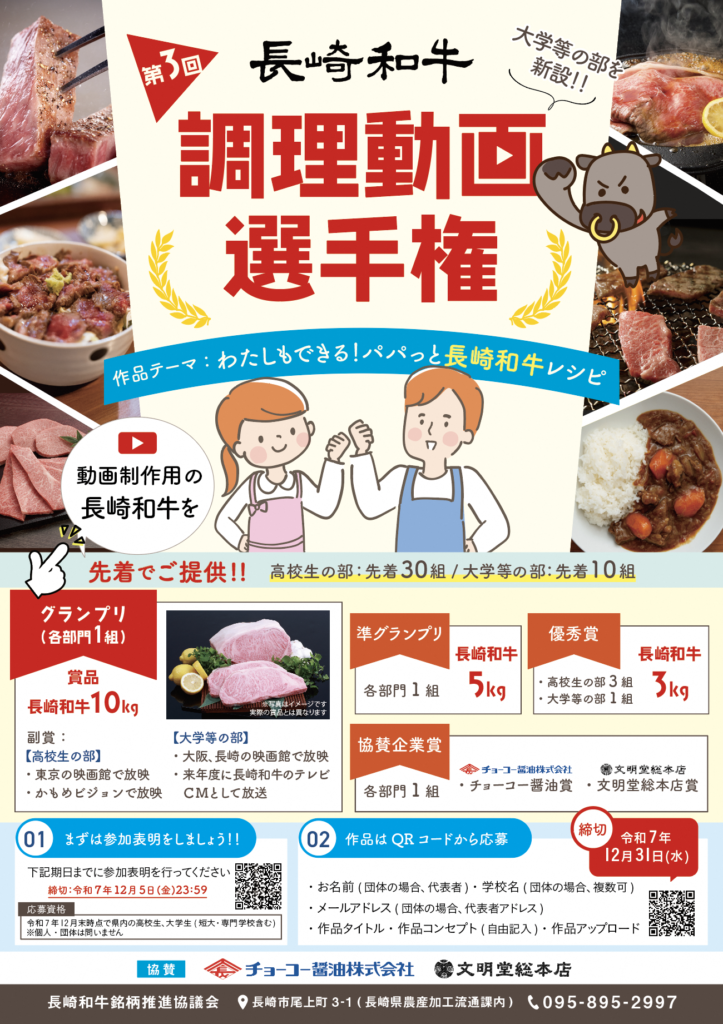 さらに今回は、参加表明した先着者(高校の部30組、大学等の部10組)に動画制作用の長崎和牛300gを提供します。